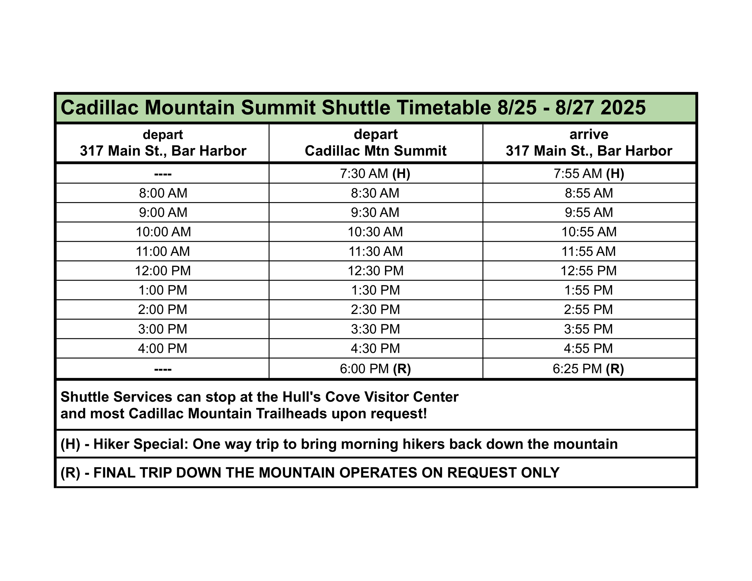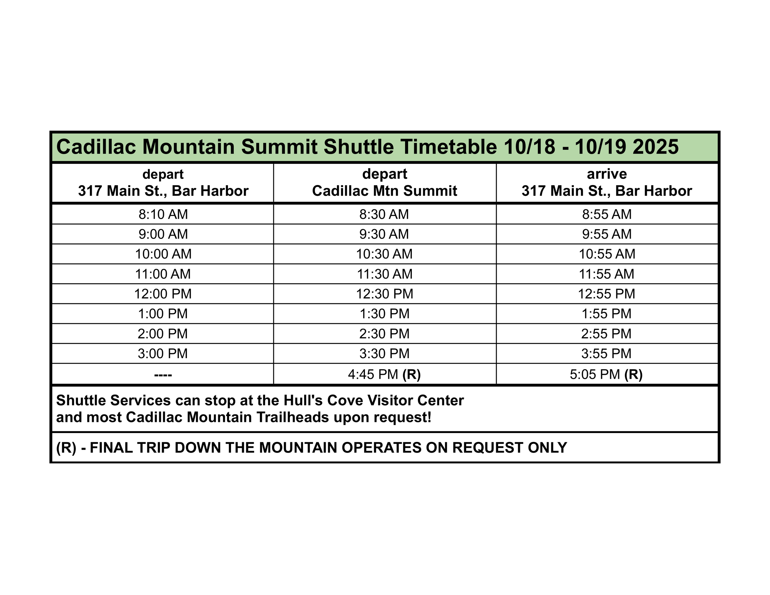 Cadillac Mountain Summit Shuttle Schedules 2025- Please note that schedules change during the season based on Sunrise & Sunset times - Slide 1 Slide 1 (current slide) Slide 2 Slide 2 (current slide) Slide 3 Slide 3 (current slide) Slide 4 Slide 4 (current slide) Slide 5 Slide 5 (current slide) Slide 6 Slide 6 (current slide) Slide 7 Slide 7 (current slide) Slide 8 Slide 8 (current slide) Slide 9 Slide 9 (current slide) Slide 10 Slide 10 (current slide) Slide 11 Slide 11 (current slide)